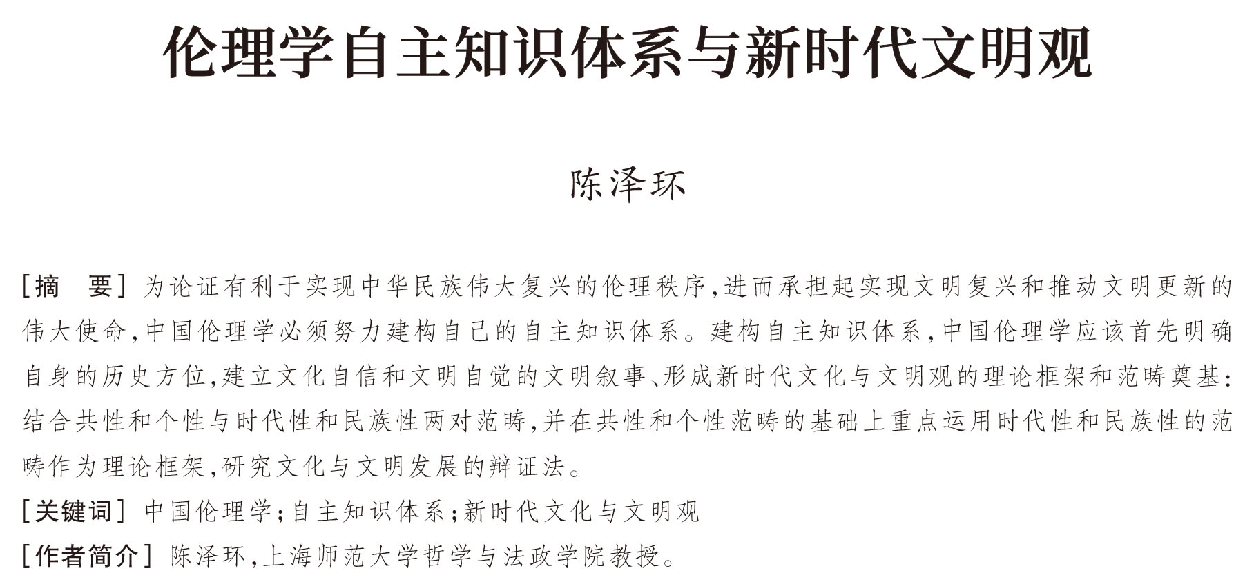为论证有利于实现中华民族伟大复兴的伦理秩序,进而承担起实现文明复兴和推动文明更新的伟大使命,中国伦理学必须努力建构自己的自主知识体系。建构自主知识体系,中国伦理学应该首先明确自身的历史方位,建立文化自信和文明自觉的文明叙事、形成新时代文化与文明观的理论框架和范畴奠基:结合共性和个性与时代性和民族性两对范畴,并在共性和个性范畴的基础上重点运用时代性和民族性的范畴作为理论框架,研究文化与文明发展的辩证法。