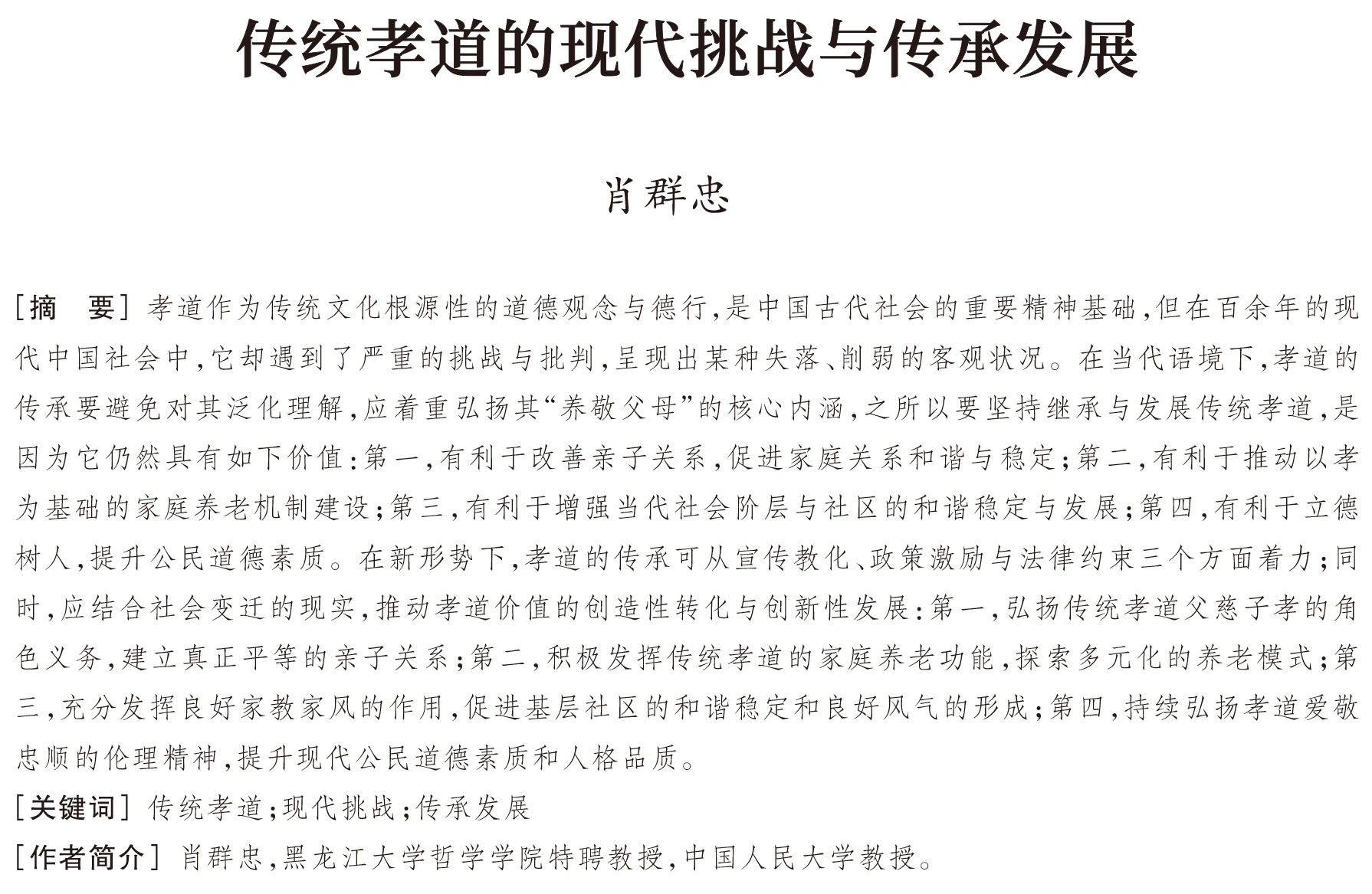 孝道作为传统文化根源性的道德观念与德行,是中国古代社会的重要精神基础,但在百余年的现代中国社会中,它却遇到了严重的挑战与批判,呈现出某种失落、削弱的客观状况。在当代语境下,孝道的传承要避免对其泛化理解,应着重弘扬其“养敬父母”的核心内涵,之所以要坚持继承与发展传统孝道,是因为它仍然具有如下价值:第一,有利于改善亲子关系,促进家庭关系和谐与稳定;第二,有利于推动以孝为基础的家庭养老机制建设;第三,有利于增强当代社会阶层与社区的和谐稳定与发展;第四,有利于立德树人,提升公民道德素质。在新形势下,孝道的传承可从宣传教化、政策激励与法律约束三个方面着力;同时,应结合社会变迁的现实,推动孝道价值的创造性转化与创新性发展:第一,弘扬传统孝道父慈子孝的角色义务,建立真正平等的亲子关系;第二,积极发挥传统孝道的家庭养老功能,探索多元化的养老模式;第三,充分发挥良好家教家风的作用,促进基层社区的和谐稳定和良好风气的形成;第四,持续弘扬孝道爱敬忠顺的伦理精神,提升现代公民道德素质和人格品质。