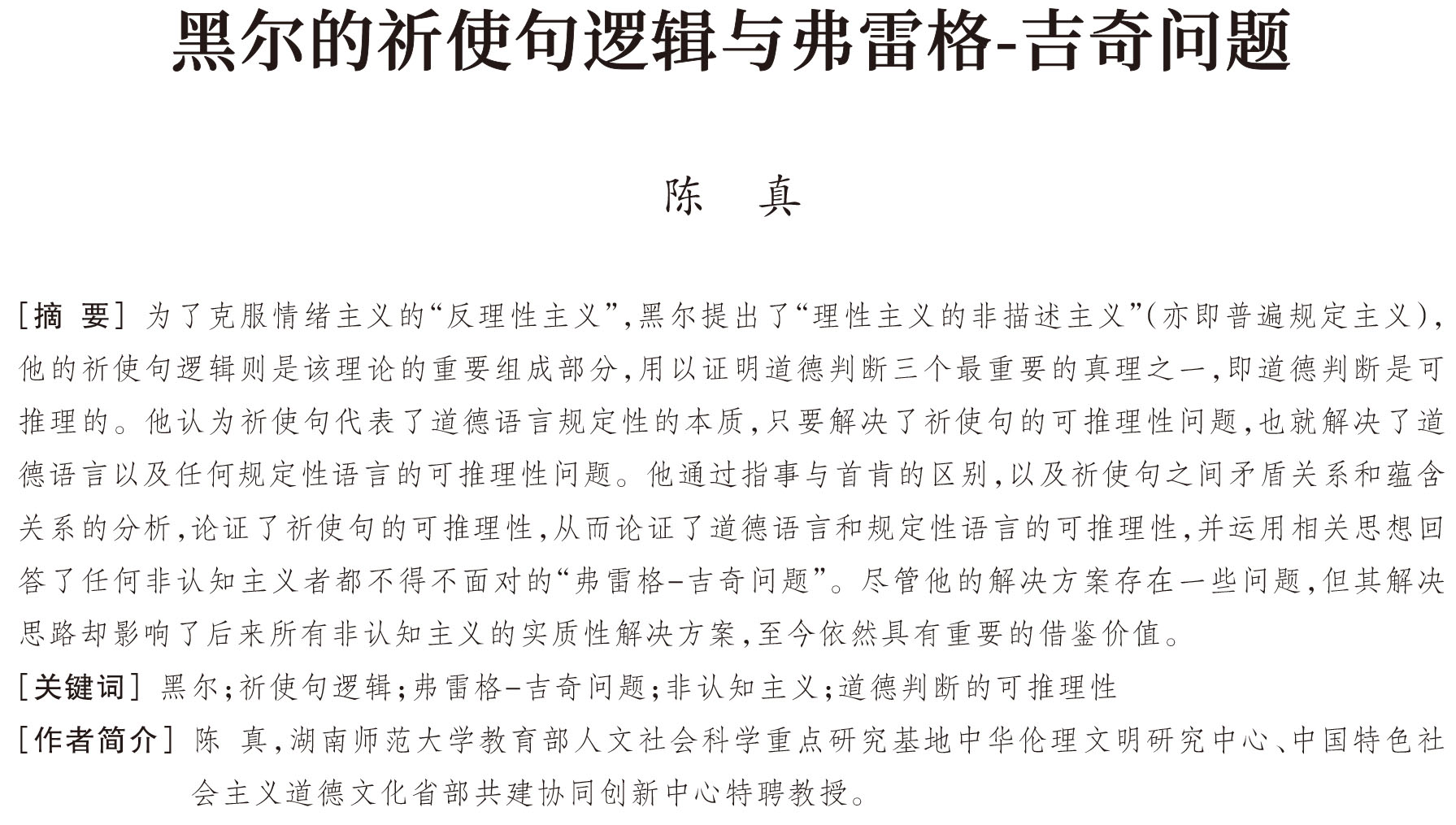 为了克服情绪主义的“反理性主义”,黑尔提出了“理性主义的非描述主义”(亦即普遍规定主义),他的祈使句逻辑则是该理论的重要组成部分,用以证明道德判断三个最重要的真理之一,即道德判断是可推理的。他认为祈使句代表了道德语言规定性的本质,只要解决了祈使句的可推理性问题,也就解决了道德语言以及任何规定性语言的可推理性问题。他通过指事与首肯的区别,以及祈使句之间矛盾关系和蕴含关系的分析,论证了祈使句的可推理性,从而论证了道德语言和规定性语言的可推理性,并运用相关思想回答了任何非认知主义者都不得不面对的“弗雷格-吉奇问题”。尽管他的解决方案存在一些问题,但其解决思路却影响了后来所有非认知主义的实质性解决方案,至今依然具有重要的借鉴价值。
