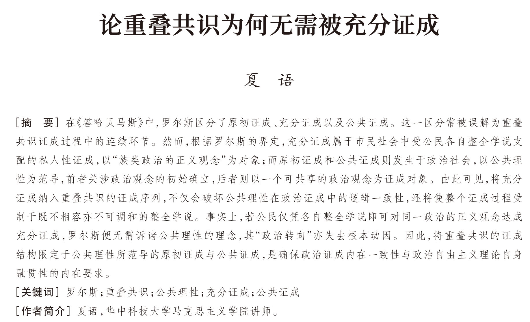 在《答哈贝马斯》中,罗尔斯区分了原初证成、充分证成以及公共证成。这一区分常被误解为重叠共识证成过程中的连续环节。然而,根据罗尔斯的界定,充分证成属于市民社会中受公民各自整全学说支配的私人性证成,以“族类政治的正义观念”为对象;而原初证成和公共证成则发生于政治社会,以公共理性为范导,前者关涉政治观念的初始确立,后者则以一个可共享的政治观念为证成对象。由此可见,将充分证成纳入重叠共识的证成序列,不仅会破坏公共理性在政治证成中的逻辑一致性,还将使整个证成过程受制于既不相容亦不可调和的整全学说。事实上,若公民仅凭各自整全学说即可对同一政治的正义观念达成充分证成,罗尔斯便无需诉诸公共理性的理念,其“政治转向”亦失去根本动因。因此,将重叠共识的证成结构限定于公共理性所范导的原初证成与公共证成,是确保政治证成内在一致性与政治自由主义理论自身融贯性的内在要求。