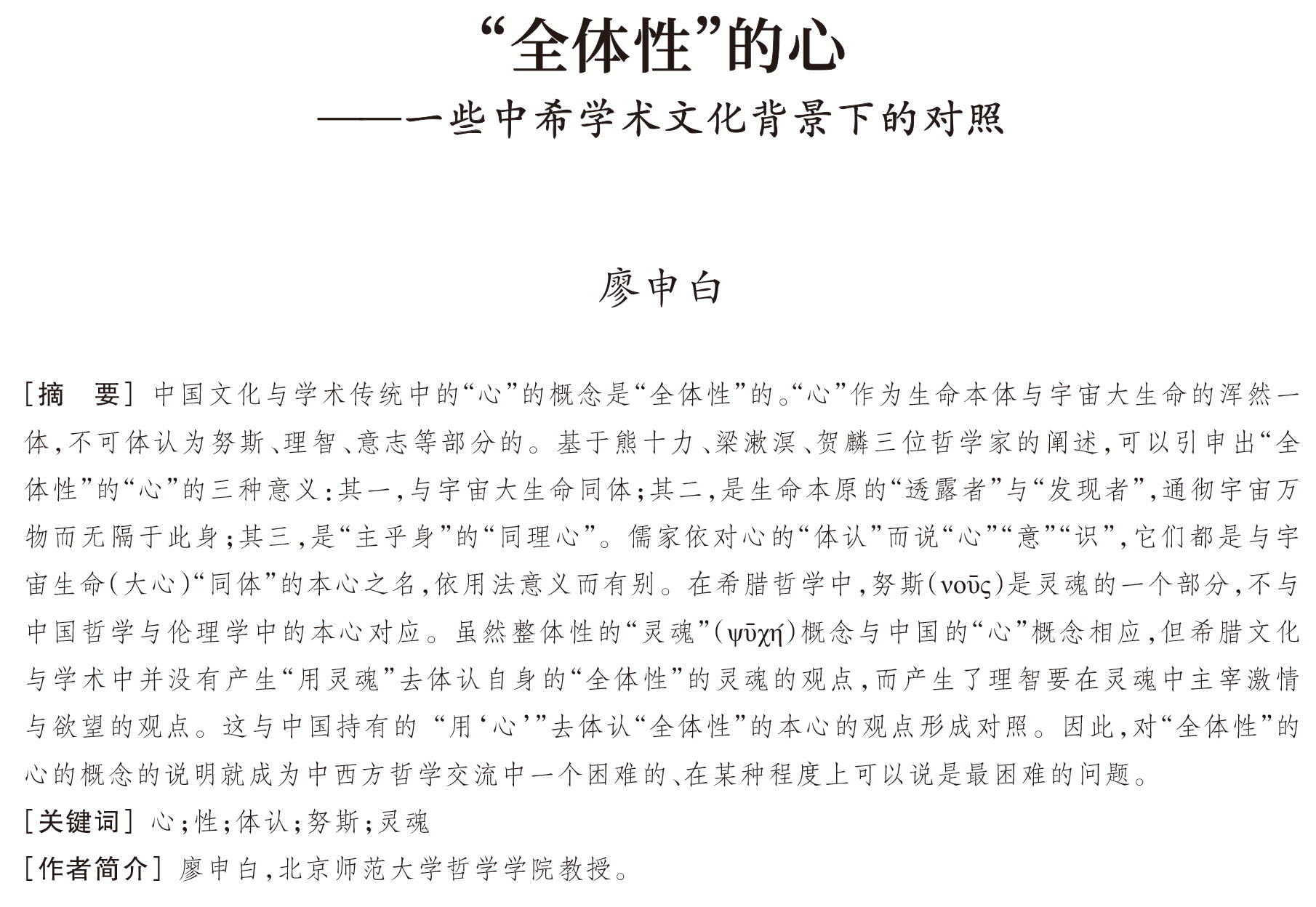 中国文化与学术传统中的“心”的概念是“全体性”的。“心”作为生命本体与宇宙大生命的浑然一体,不可体认为努斯、理智、意志等部分的。基于熊十力、梁漱溟、贺麟三位哲学家的阐述,可以引申出“全体性”的“心”的三种意义:其一,与宇宙大生命同体;其二,是生命本原的“透露者”与“发现者”,通彻宇宙万物而无隔于此身;其三,是“主乎身”的“同理心”。儒家依对心的“体认”而说“心”“意”“识”,它们都是与宇宙生命(大心)“同体”的本心之名,依用法意义而有别。在希腊哲学中,努斯(νοῡς)是灵魂的一个部分,不与中国哲学与伦理学中的本心对应。虽然整体性的“灵魂”(ψῡχή)概念与中国的“心”概念相应,但希腊文化与学术中并没有产生“用灵魂”去体认自身的“全体性”的灵魂的观点,而产生了理智要在灵魂中主宰激情与欲望的观点。这与中国持有的 “用‘心’”去体认“全体性”的本心的观点形成对照。因此,对“全体性”的心的概念的说明就成为中西方哲学交流中一个困难的、在某种程度上可以说是最困难的问题。